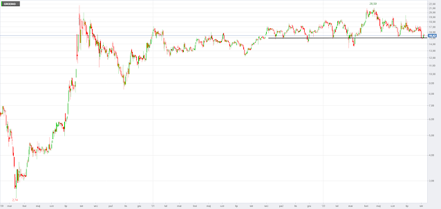 Powody do niepokoju daje w ostatnich tygodniach Grodno. Jeszcze pod koniec kwietnia wydawało się, że kurs jest na dobrej drodze do kontynuowania trendu wzrostowego i ustanawiania nowych maksimów cenowych. Jednak od tamtego czasu notowania zaczęły zniżkować i obecnie zbliżamy się do testowania bardzo wyraźnego wsparcia na poziomie 15 zł.